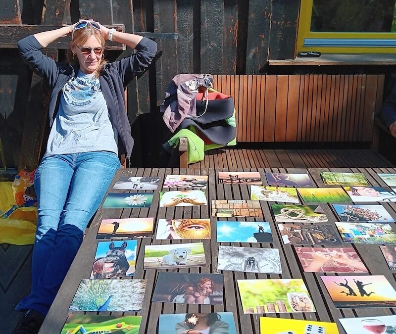 Jeder durfte sich zwei bis drei Postkarten auszusuchen und anhand derer seine Werte und was einem wichtig ist reihum erläutern. Mit allen Karten auf dem Tisch bildeten wir Cluster und diskutierten eine Formulierung für unsere gemeinsamen Werte.